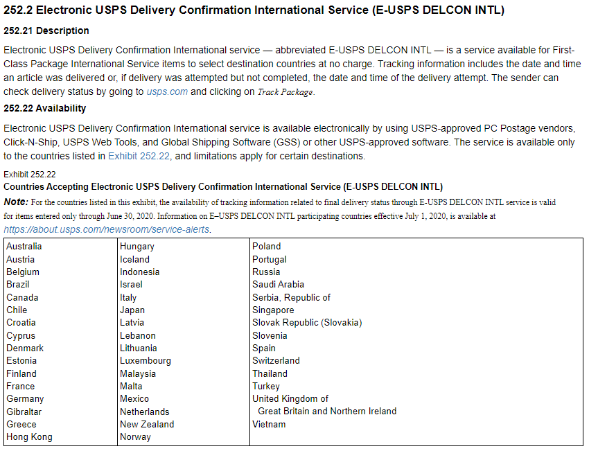 USPS First Class International tracking / delivery confirmation dropped for most countries